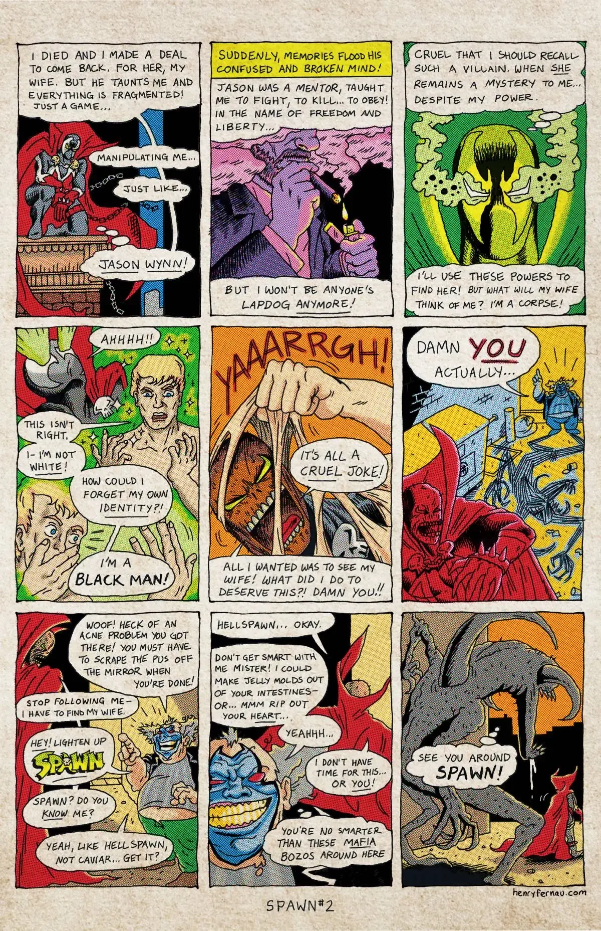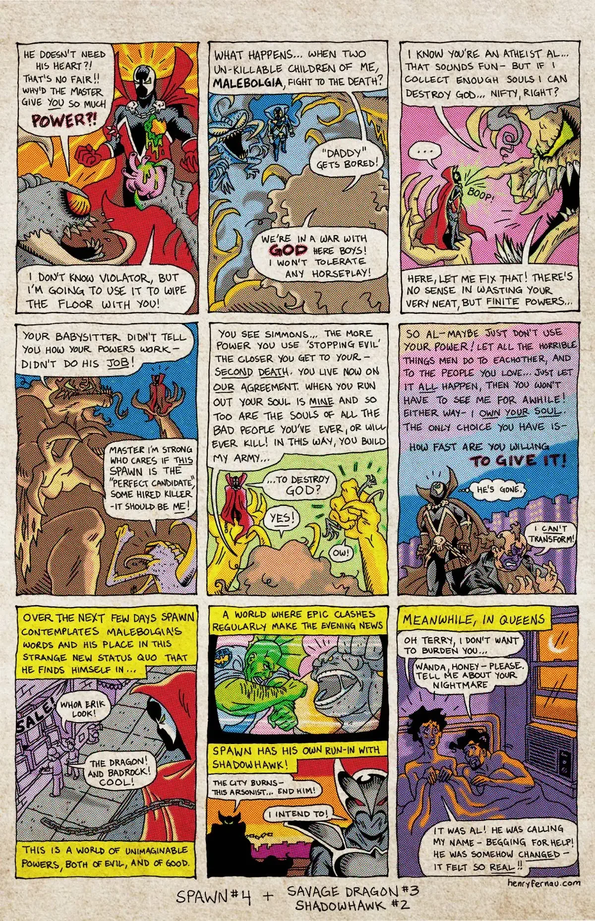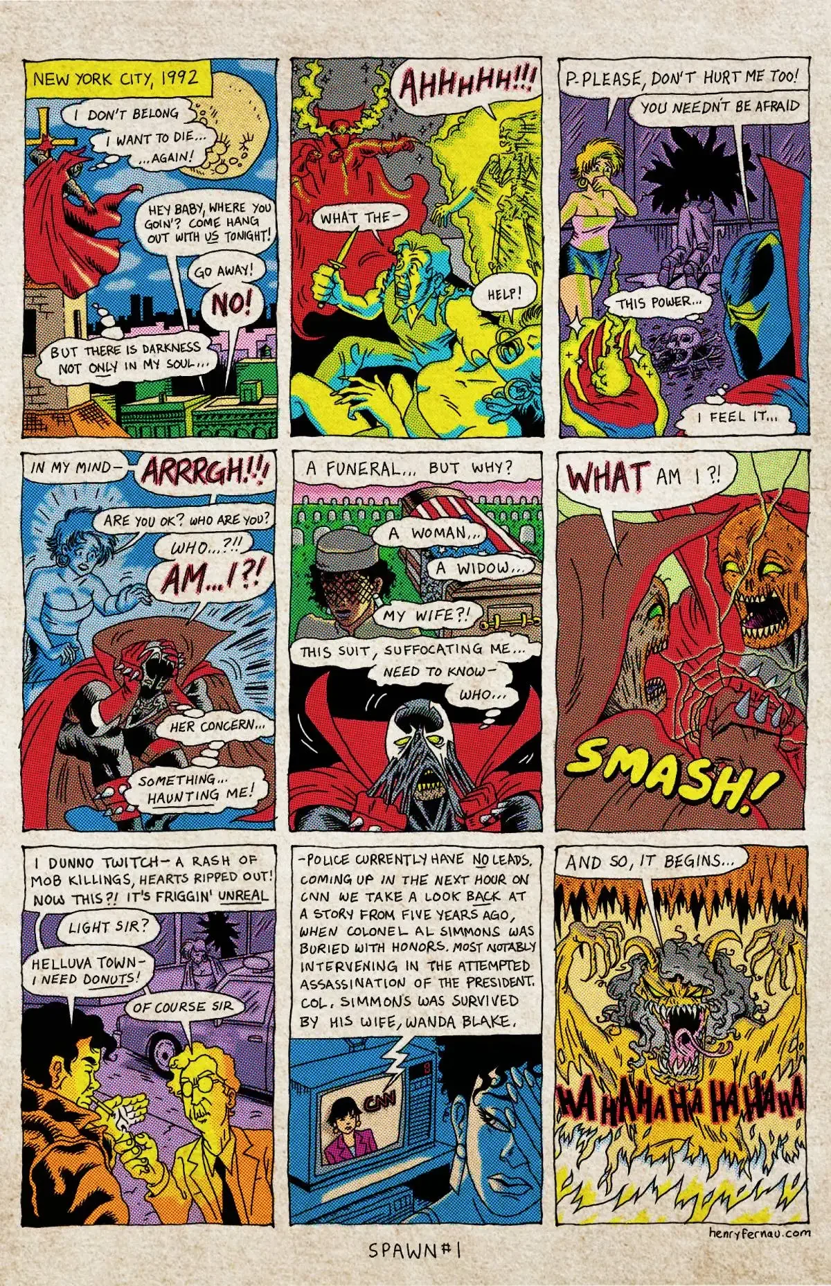 This is a FREE fan retelling of the first eight years of Todd McFarlane’s supernatural superhero Spawn that debuted in 1992. My goal is to abbreviate each of the first 100 issues of Spawn (as well as related tales and stories) into approximately one page of comics.